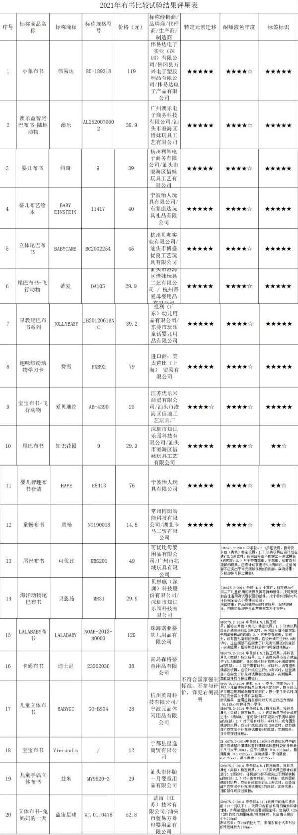 布书上可能带有的挤压玩具、摇铃等,若进入宝宝嘴部可能伤及喉咙。这次的检测中,共5款布书的部件突出物不符合标准要求。分别为可优比尾巴布书的牙胶部件、LALABABY布书的摇铃和塑料部件、迪士尼卡通布书的塑胶部件、BABYGO儿童立体布书的摇铃部件、益米儿童手偶立体布书的牙胶部件。