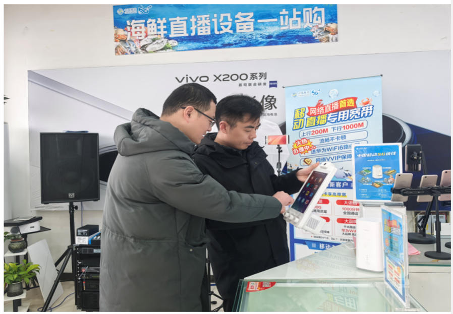 在连云港海头镇,海鲜养殖户们正抢着预约赣榆乡镇东北网格营业厅的直播间。这里不仅有全套设备,营业员还会陪养殖户一起吆喝卖海鲜,手把手教授他们直播话术、设备操作和电商运营技巧。“网络+设备+内容+产业”的服务闭环,让养殖户们的生意越来越红火。