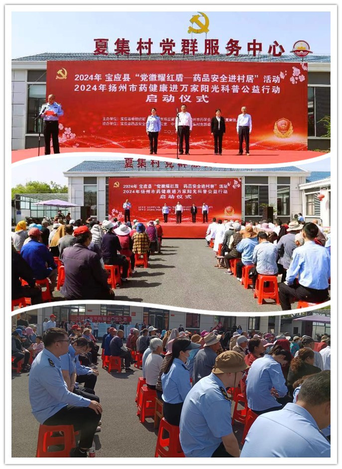 “关爱生命健康,守护用药安全”。 为深入实施“1+N”党建服务进村居活动,进一步普及安全用药知识,增强合理用药意识,提高公众安全用药水平,保障人民群众“安全消费、健康生活”。近日,宝应县市场监管局在夏集镇夏集村举办“党徽耀红盾——药品安全进村居”活动暨扬州市药健康进万家阳光科普公益行动启动仪式。活动由中共宝应县委组织部、县市场监管局、市药学会和夏集镇政府共同举办,市场监管各分局、药店从业人员和部分群众代表等参加了活动。
